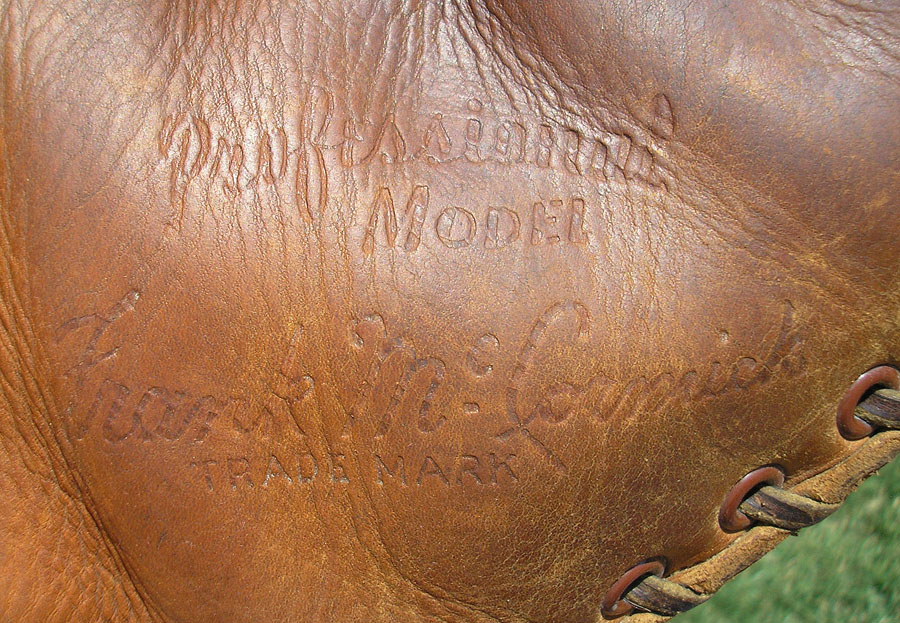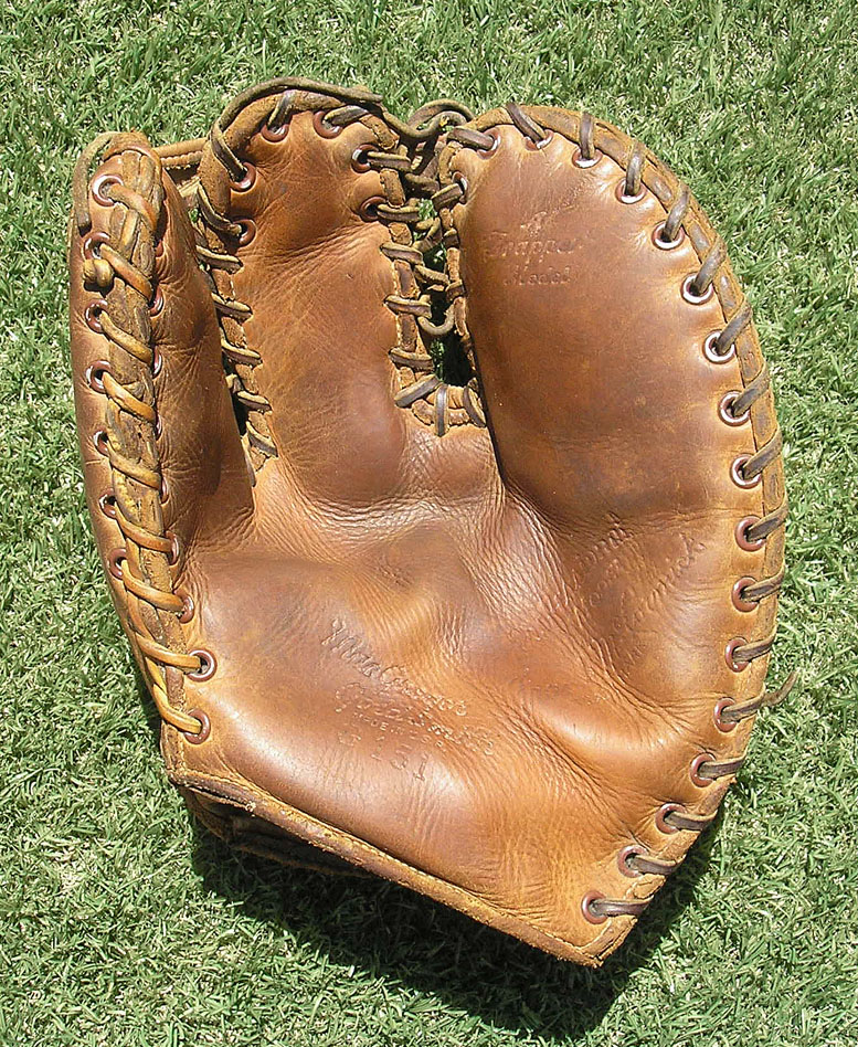 7. Ray Crone, Spalding 1174. A nice quality mid-sized glove with smooth inside lining. Has light labeling. Crone had several fine seasons with the Milwaukee Braves during the mid 1950's. He also pitched with the inagural 1958 San Francisco Giants. RHT Ex+ $35