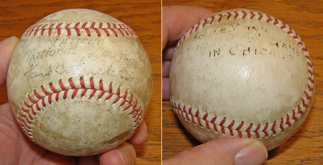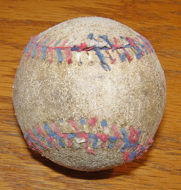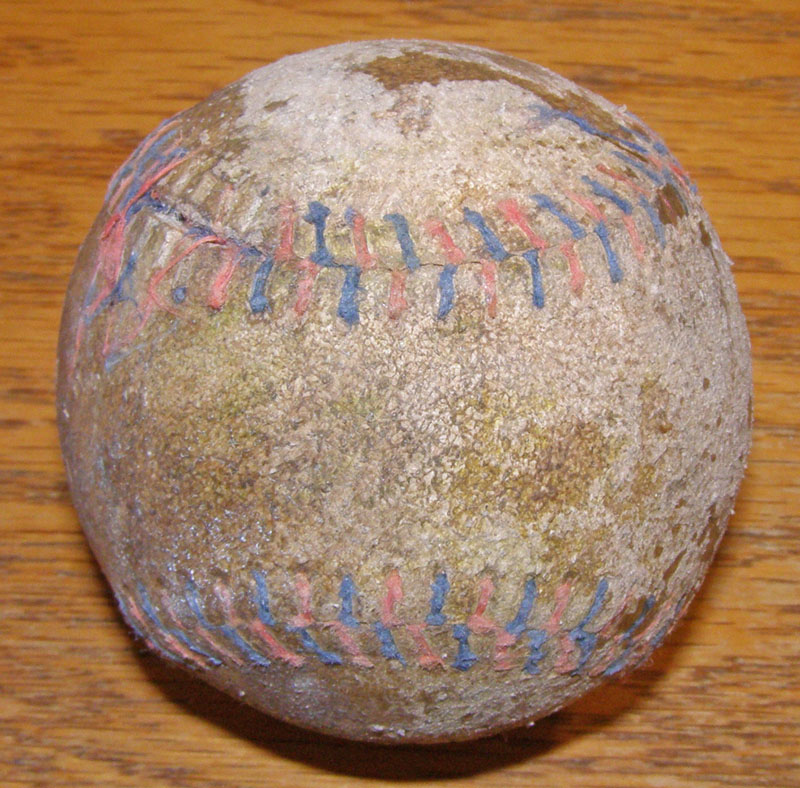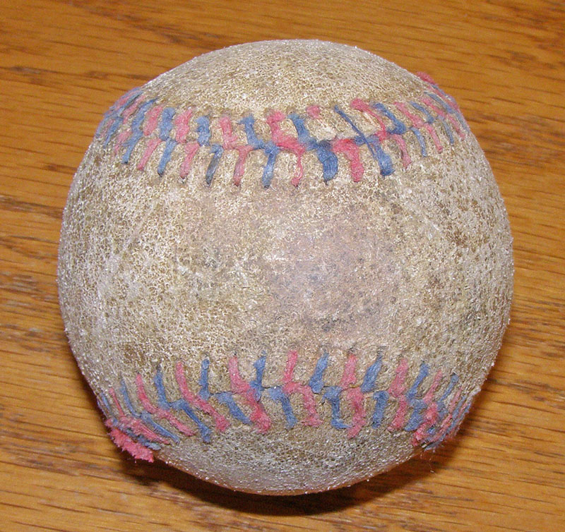 1. 1920's-30's Red & Blue Stitched Baseball. Unknown manufacturer. Has staining and less than an inch of pulled stiching. No holes, cuts or writing. Displays nicely from one side. Vg+ $75