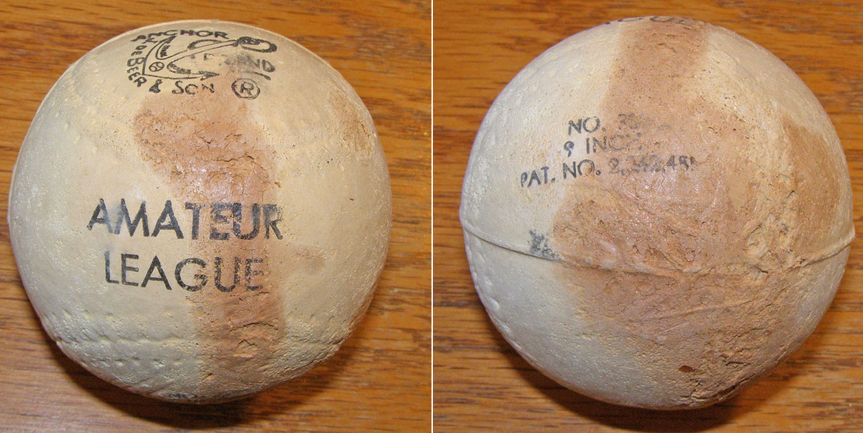 7. WW2 Era 1940's Rubberized Baseball. J. DeBeer Anchor Brand. Has patent # 2,242,455 which was granted to DeBeer in 1941. One of the earliest rubberized baseballs. Has some staining and rubber deterioration. Good labeling. Vg $35
