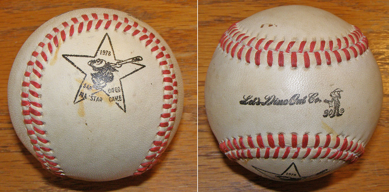 31. 1978 San Diego Padres All-Star Game Commemorative Baseball. Nice leather baseball commemorating the 1978 All-Star game which was held in San Diego. Very light stains. Joe Ryan President. Has light labeling. No writing, cuts or torn stitching. Ex+ $25