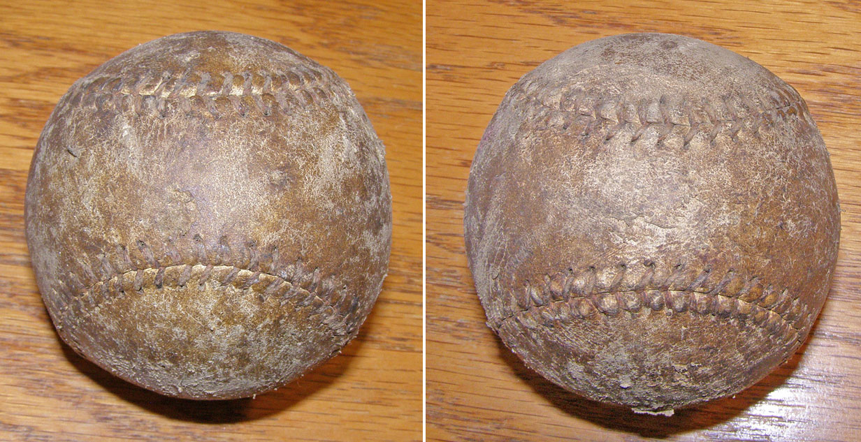 4. 1920's-30's Baseball. Unknown manufacturer. Has small tight stitching indicative of pre 1920's baseballs. Nice patina. All the stitching is intact. Has scuffing but no holes, cuts or writing. Ex+ $50