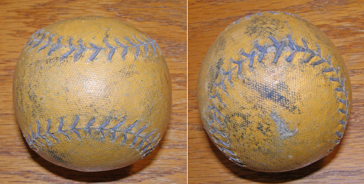 3. 1920's-30's Bounder Baseball. Unknown manufacturer. Slightly smaller than regulation size. Has nice coated canvas or oilskin covering. Faded yellow with blue stitching. has a quarter inch gouge. No writing. Ex+ $65