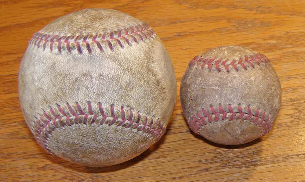 5. 1930's Junior Size Baseball. Unknown manufacturer. Has a great antique dark brown (almost black) color and patina. About 2/3 the size of a regulation ball. High quality leather ball with great stitching. Very nice. Ex/Mt+ $40