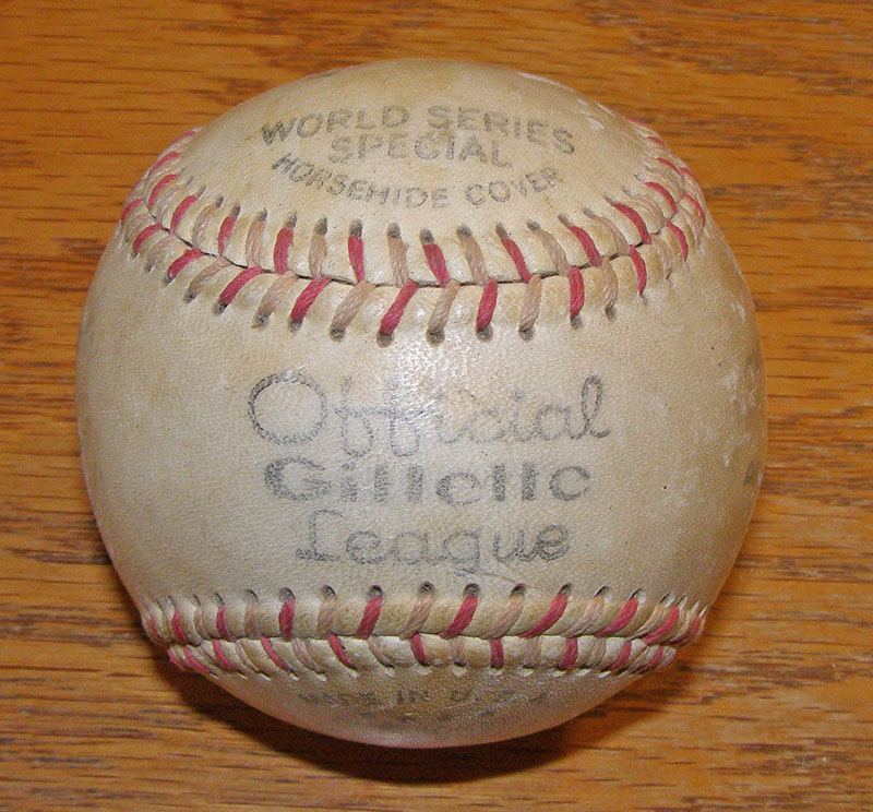 11. 1940's-50's Cork Ball. Unknown manufacturer. Basically a tiny baseball. Cork Ball has been around since the 1880's and was invented in St. Louis and was a favorite childhood game of Yogi Berra among others. Has scuffing and marks but all stitching is intact with no rips or holes. Ex+ $35