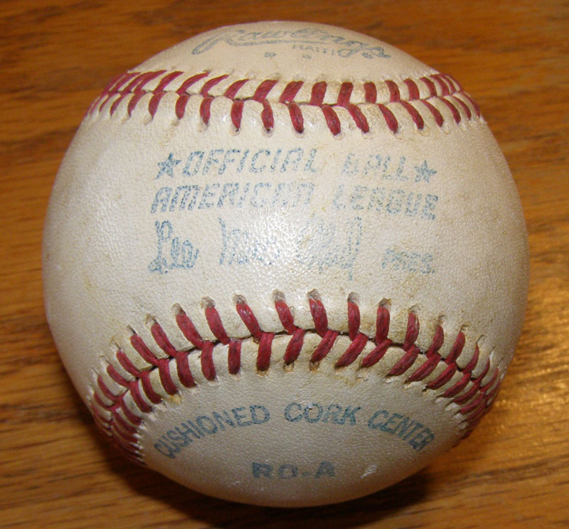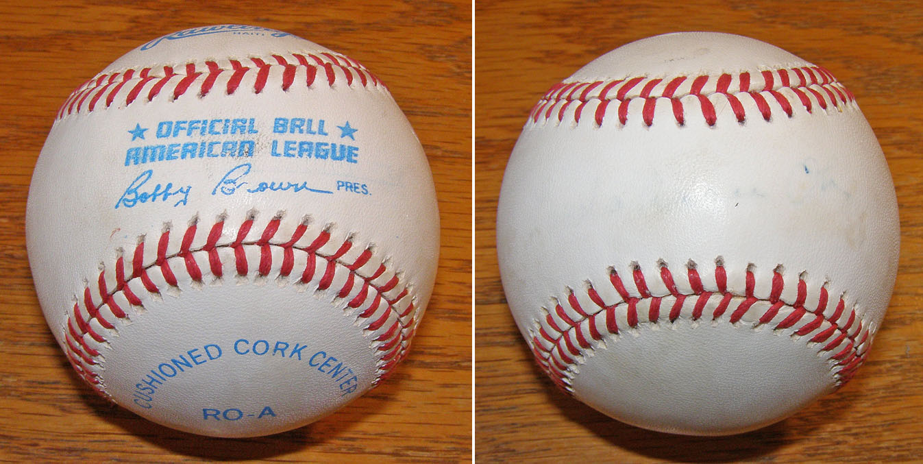 33. 1970's-80's Lee MacPhail American League Baseball. Rawlings. Has readable labeling. Has dirt and marks from game use. No cuts or torn stitching. Ex+ $25