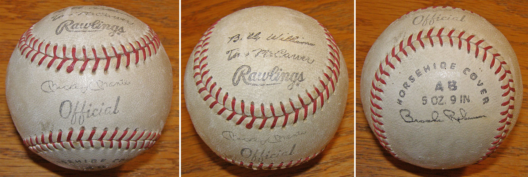 9. 1947 MacGregor Goldsmith Baseball. MacGregor Goldsmith "Official 97 League". Nice ball with very light labeling. Has a couple of small gouges and light staining. Has 1947 written in fountain pen on the ball. Ex+ $35