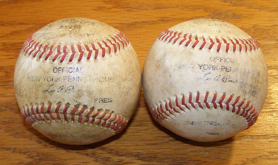 15. Pair of 1980's New York-Penn League Baseballs. Wilson A1010. Leo Pinkney President. Light labeling. Good game used condition with scuffs and marks. Both balls have nice stitching and no writing. Vg/Ex+ $30