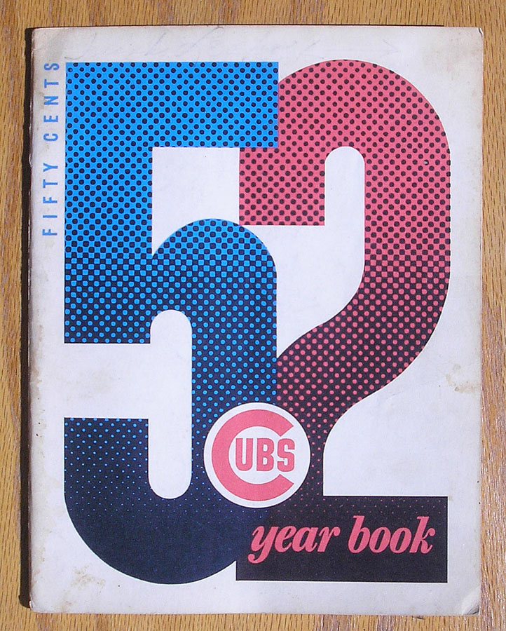 1952 Chicago Cubs Yearbook. 40 pages. Has a great double page roster. Has individual bio's and photos for each player plus a full page team photo. The cover has light edge stains, the interior pages are very nice. Ex+ $65