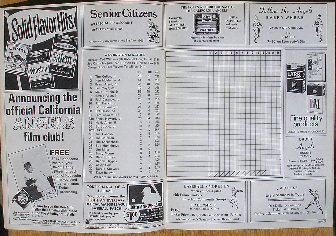 8/2/69. Ted Williams is the Senators manager. The Senators have Frank Howard, Mike Epstein, Dick Bosman etc.. California has Andy Messersmith, Jim Fregosi, Hoyt Wilhelm etc.. Includes newspaper clippings. Great condition. Ex/Mt+ $25