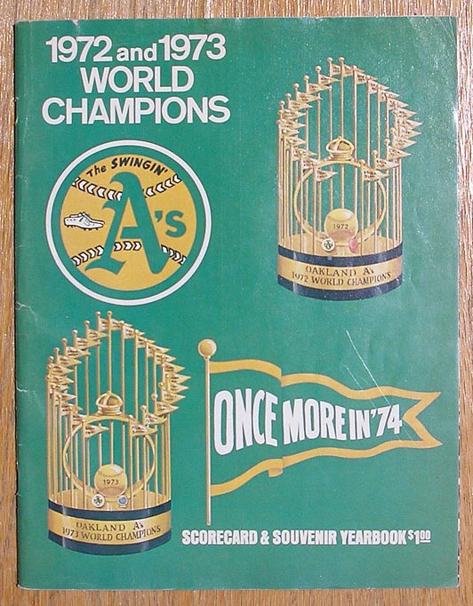 1974 Oakland A's Yearbook. 74 pages. The A's third straight World Series Championship. The A's have Reggie, Catfish, Vida, Blue Moon, Rollie, Rudi, Bando