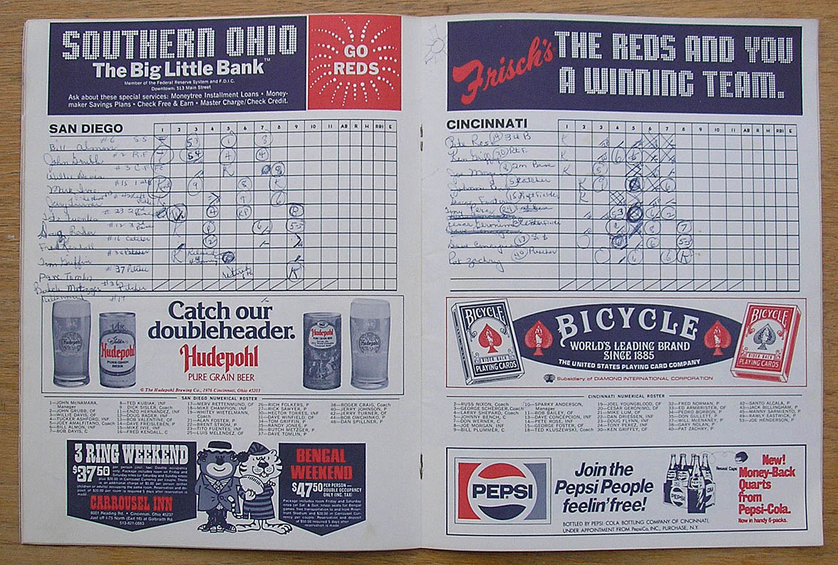 7/5/69.. Dodgers win 6-5. The Dodgers have Don Sutton, Don Drysdale, Maury Wills, Bill Russell etc... The Reds have Johnny Bench, Pete Rose, Lee May etc.. Comes with newspaper articles. Very nice condition. Ex/Mt $20